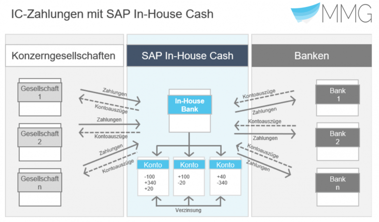 Das SAP-Modul In-House Cash (IHC) hat sich seit vielen Jahren als Lösung für die Einrichtung einer In-House Bank bewährt. IC-Verrechnungskonten werden im IHC als interne Bankkonten geführt und verfügen über alle Funktionen, die man von externen Bankkonten gewohnt ist: valutarische und buchhalterische Saldenübersichten, Kontoauszüge, Umsatzlisten sowie flexible Zins- und Gebührenkonditionen.